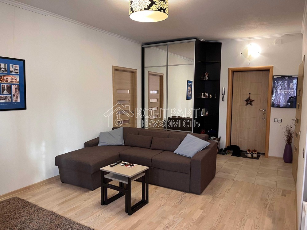 2 поверх. Сучасний ремонт. Простора кухня-студія (32 м2), спальня (17 м2), санвузол (7), балкон з видом на парк (5.8 м2).