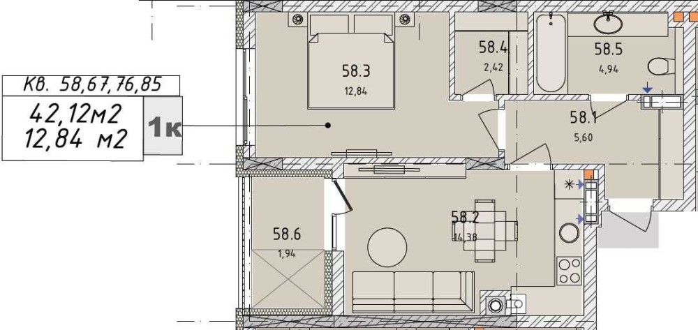 • Общая площадь 43 м2