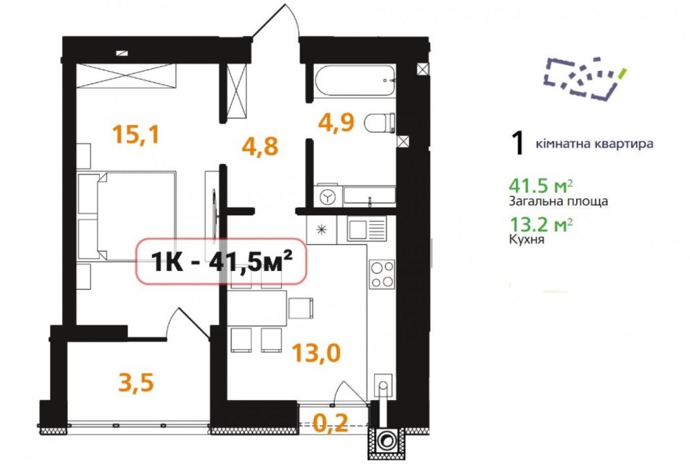 • Общая площадь 41 м2