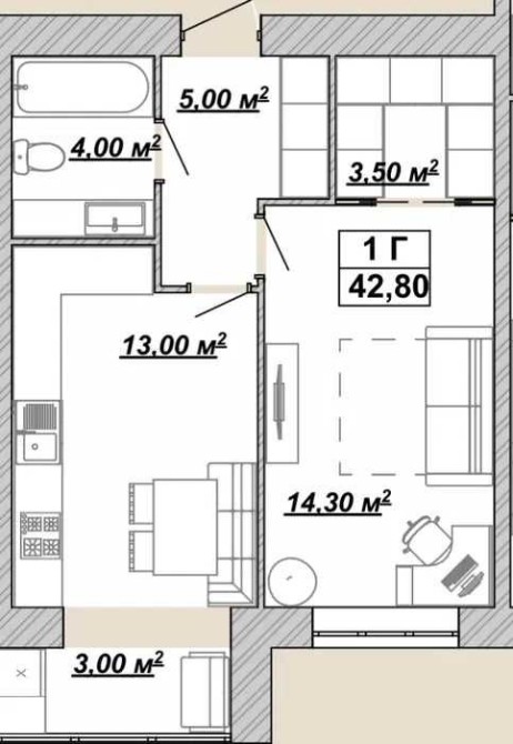 • Общая площадь 42.8 м2