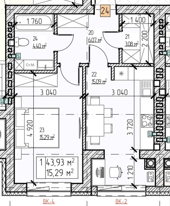 • Общая площадь 43.93 м2