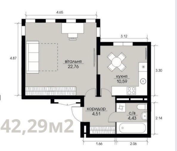 • Общая площадь 42.29 м2