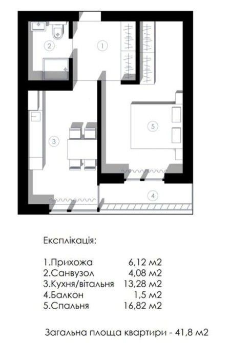 Якісно розпланована площа: прихожа-6,12 м.кв, санвузол-4,08 м.кв, кухня/вітальня-13,3 м.кв, спальня-16,9 м.кв.