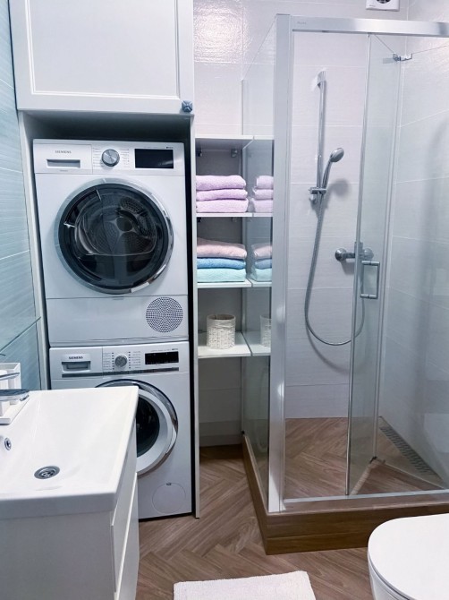 Повна комплектація техніки преміум-класу. Вся техніка вбудована та нова, від провідних виробників: холодильник, варильна поверхня, духова шафа, мікрохвильова піч, посудомийна машина, пральна машина, сушильна машина, бойлер, ,кондиціонер.