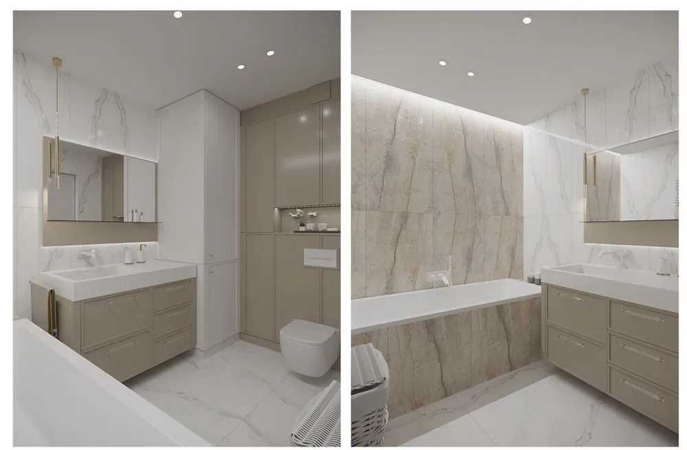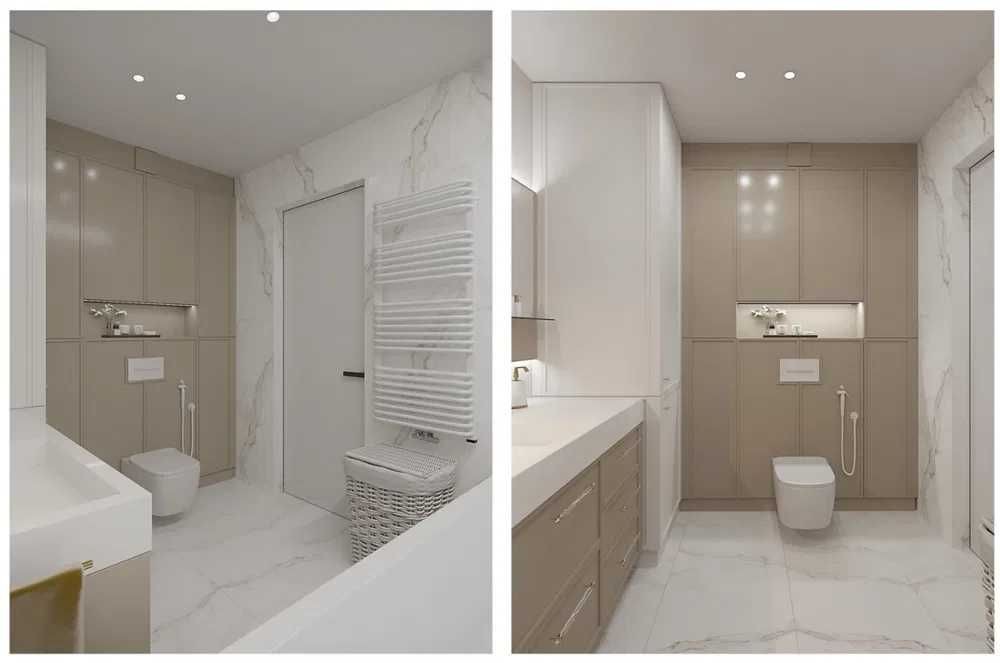 Великий санвузол дозволяє втілити будь-які дизайнерські рішення — встановити ванну або душову кабіну, пральну машину чи додаткові системи зберігання.