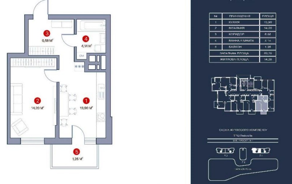 Загальна площа квартири 40,54 кв.м, житлова – 14,2 кв.м, кухня – вітальня – 14,1 кв.м, поверх 8/25.