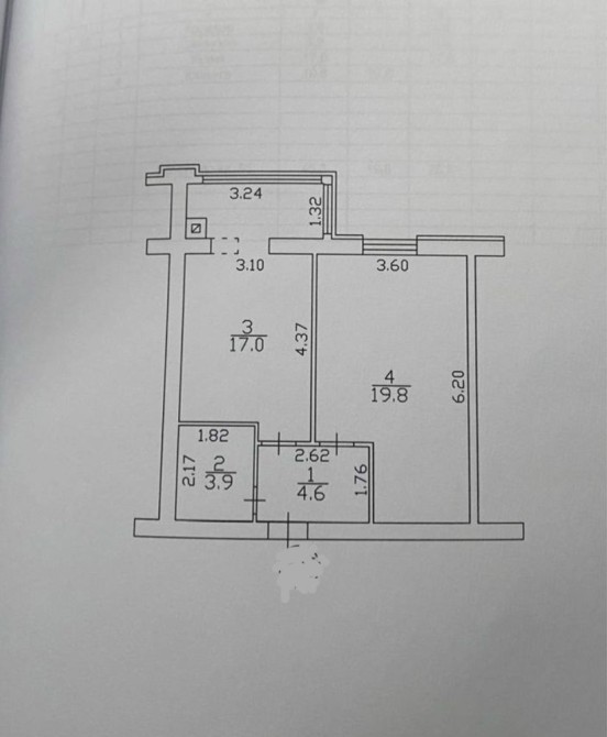 Загальна площа 45.5 кв.м, кухня 17 кв.м, кімната 20 кв.м, санвузол суміжний.