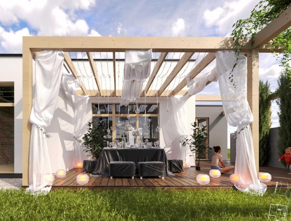 Ширина земельної ділянки 12.5 метри, тобто 2 паркомісця попереду будинку та атмосферний дворик позаду.