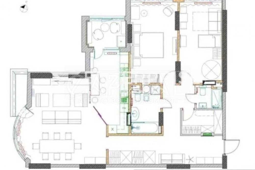 Простора вітальня із кухнею, 2 спальні кімнати, 2 санвузли, 2 балкони, гардеробна, коридор. Розроблено детальний дизайн-проект!