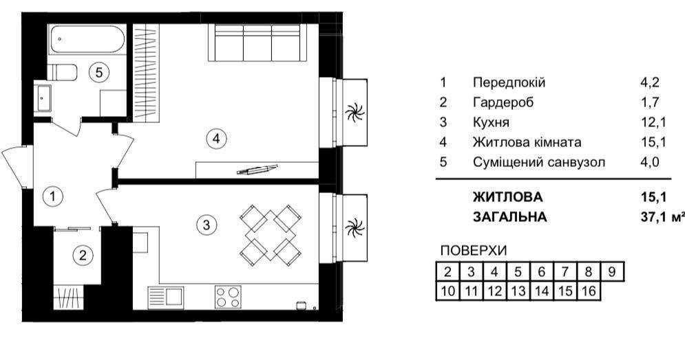 Загальна площа — 37,1 м². Поверх — 4/17. Висота стелі - 3 метри.