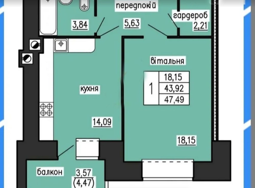 Продається однокімнатна квартира у новобудові. Загальна площа 47,5 м.кв.. Роздільне планування, простора окрема кухня площею 14 м.кв, кімната 18 м.кв., суміжний санвузол, гардеробна кімната та балкон. Квартира сира, зроблено розводку під електрику, поштукатурено стіни. Розташована на затишному 3 поверсі 10-ти поверхового будинку. Будинок збудовано з цегли.