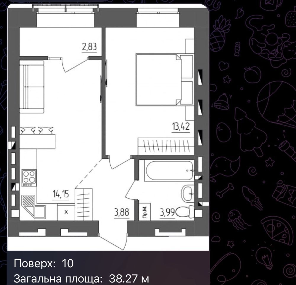 - загальна площа 38,27м2, розташована на 10 поверсі;