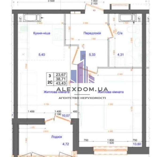• Общая площадь 43.4 м2