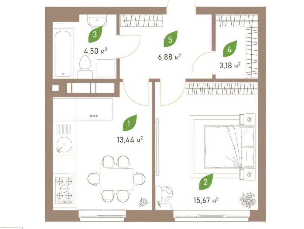 • Площадь кухни 13.44 м2