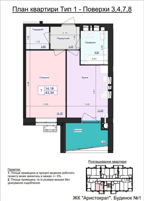 Продаж 1 кімнатної квартири на 2 поверсі, 43,82 М2 загальна, з балконом та гардеробною.