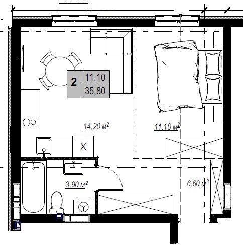• Общая площадь 35.8 м2