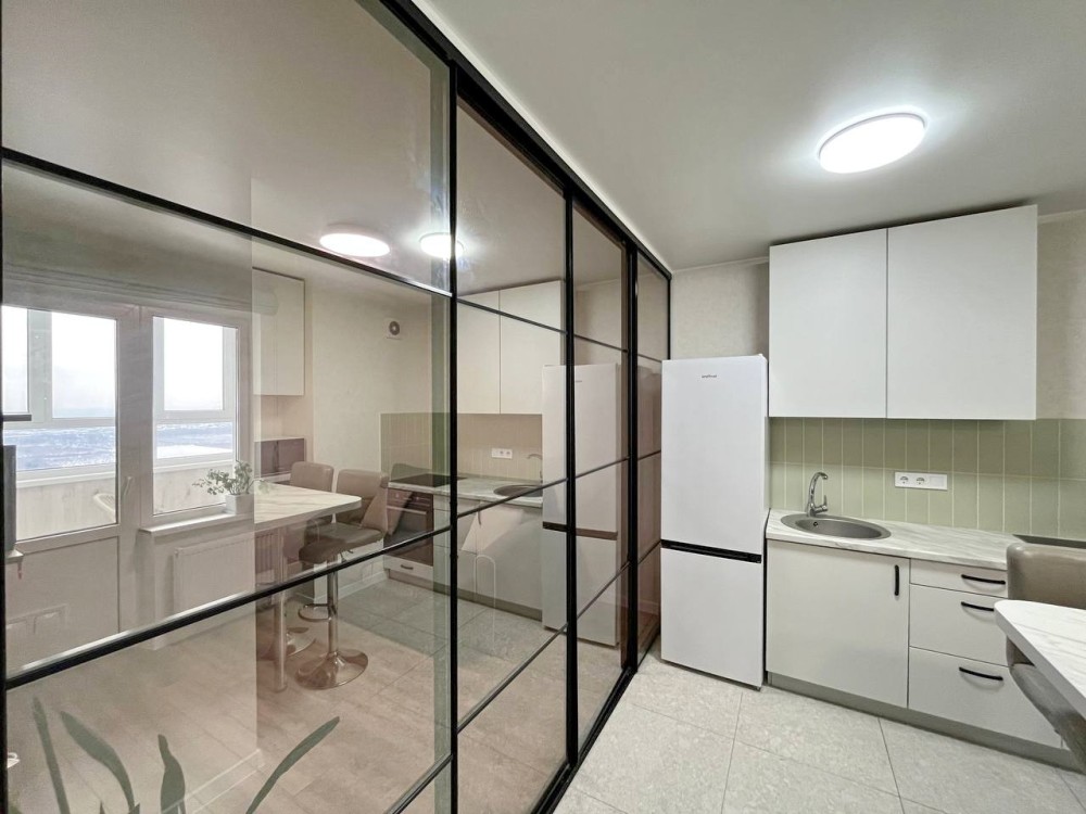 Продаж двокімнатної квартири (євродвушка) в Голосіївському районі, ЖК "Одеський бульвар" по вул. Приміська, 26А. Квартира розташована на 25 поверсі 25-поверхового утепленого будинку. Є генератор. Загальна площа 39,5 кв.м., кухня відділена розсувною перегородкою, простора та видова. Ремонт робили для себе. Є вся необхідна техніка (кондиціонер, пральна машина, духова шафа, варильна поверхня, холодильник, бойлер).