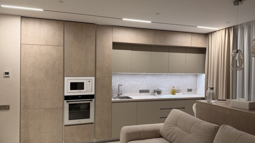 • гіпсова стеля з багаторівневим освітленням, яке ефектно підкреслює функціональні зони вітальні, кухні, обідньої зони, гардеробу, дзеркал і карнизів
