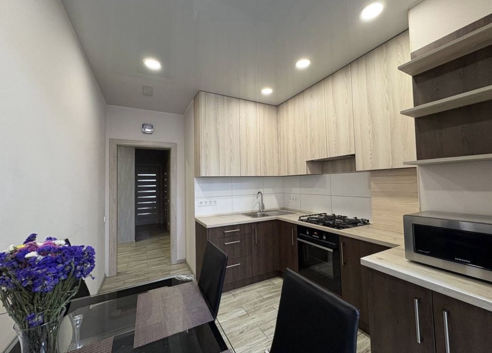 Квартира двостороння, повністю укомплектована меблями та технікою, є простора гардеробна.