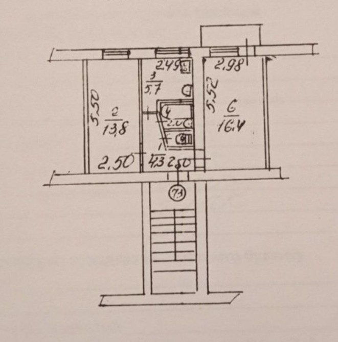 -Загальна площа 44.3 кв.м,2 кімнати(13.8 та 16.4),кухня 5.7 кв.м