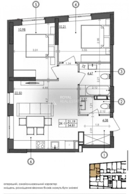 Квартира має дві окремі спальні кімнати та простору кухню-вітальню.