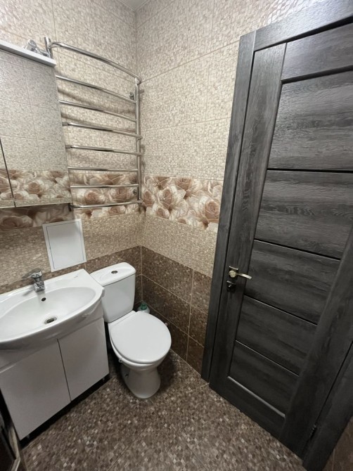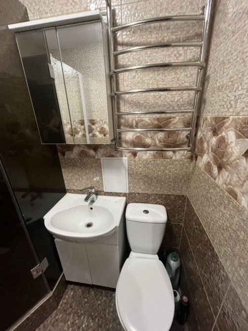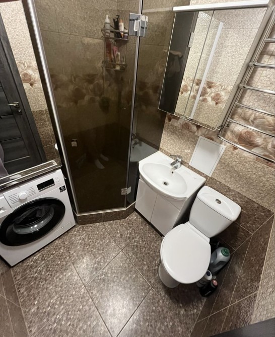 • санвузол суміжний, облицьований сучасним кахелем, з новою сантехнікою, та стильною душовою кабіною;