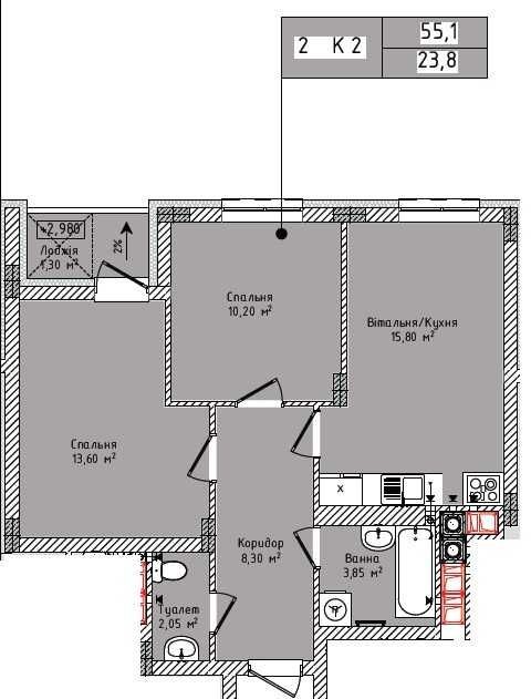 • Общая площадь 55 м2