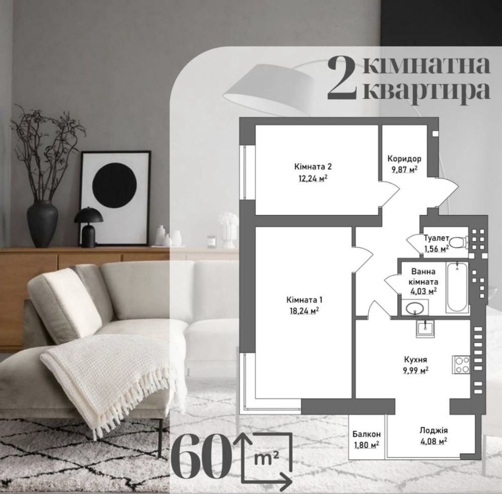 Загальна площа 60,5 кв.м., з них дві спальні 18 та 12 кв.м., кухня з лоджією 14 кв.м., балкон 1,8 кв.м., гардероб з коридором 9 кв.м., та роздільний санвузол.
