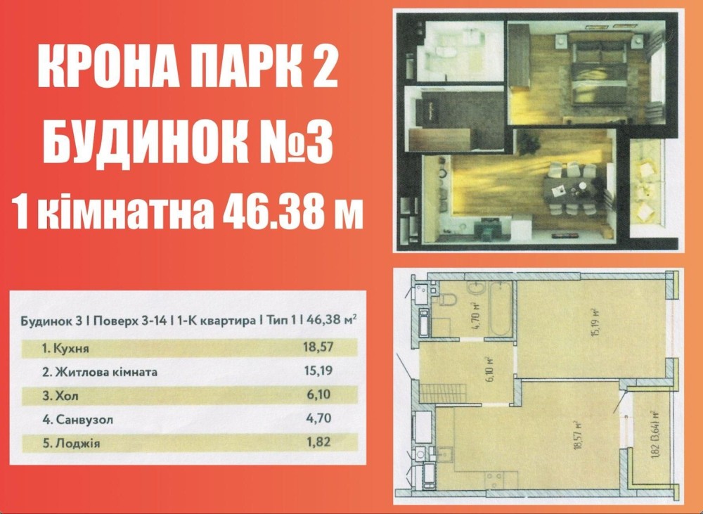 Загальна площа - 46,38 кв.м., кухня-вітальня 18,57 кв.м, спальня, передпокій, санвузол, гардеробна, лоджія.