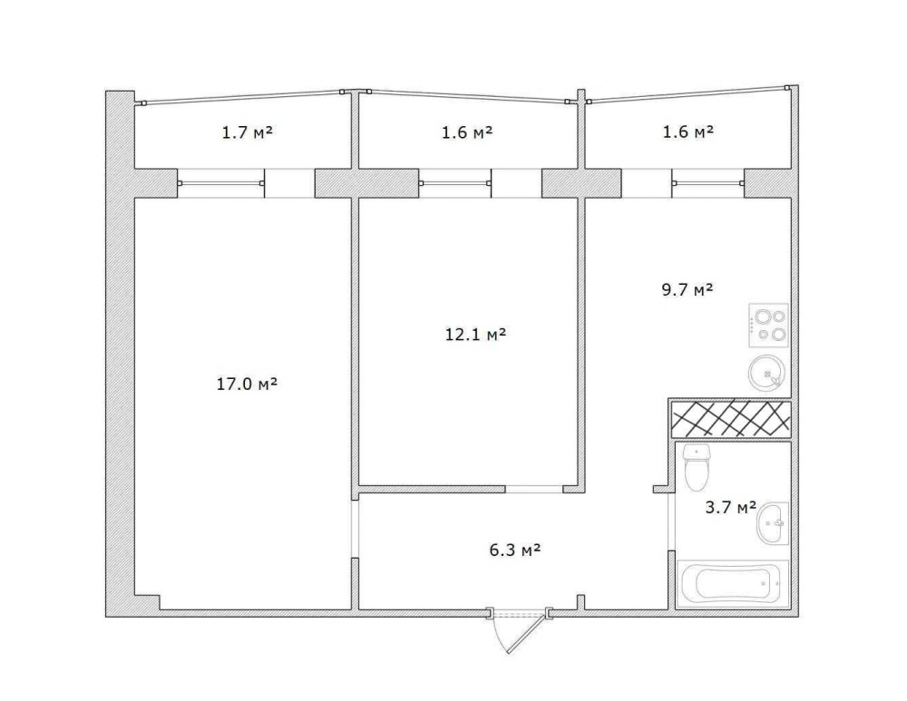 Загальна площа - 53.7 кв.м: кухня 9.7 кв.м, 2 окремі кімнати 29,1 кв.м., суміжний санвузол, три засклені лоджії.