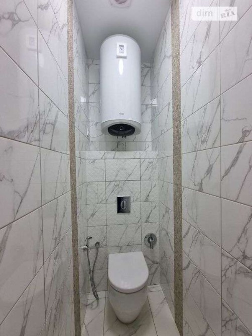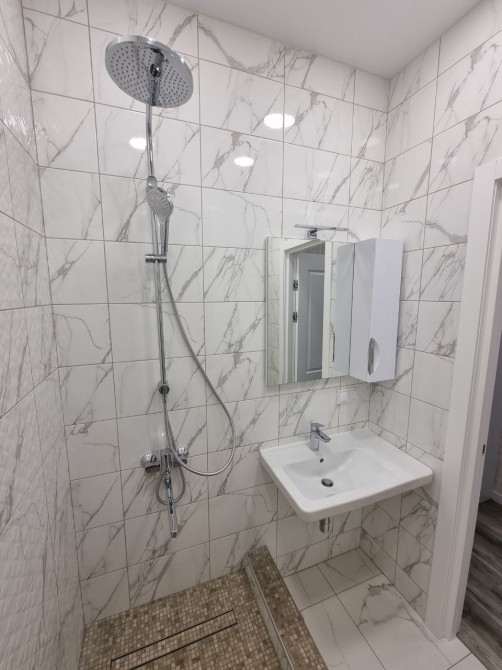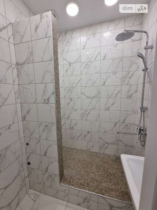 Роздільний санвузол оформлений сучасною плиткою "під мармур". Встановлені тропічний душ та підвісний унітаз з інсталяцією.