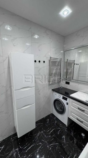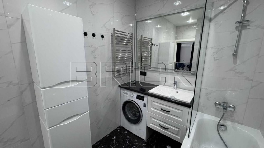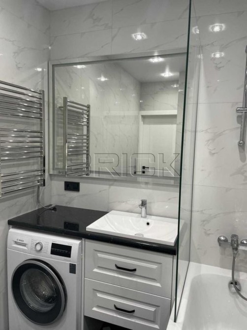Санвузол укомплектований якісною сантехнікою: підвісний унітаз, змішувачі Hansgrohe, дзеркало з підсвічуванням, тумба з умивальником та висувними ящиками з доводчиками. Є тепла підлога, пральна машина Bosch, бойлер та ванна Ravak зі скляною шторкою.
