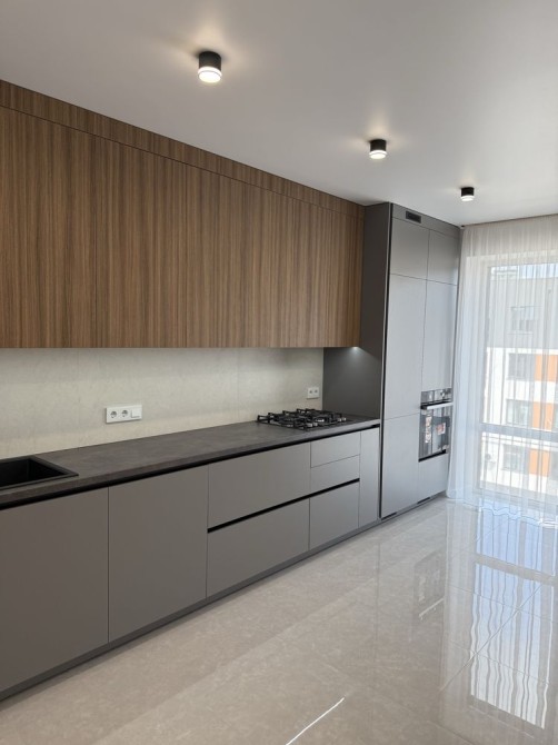 Кухня повністю укомплектована: сучасні меблі, варильна газова поверхня, духова шафа, вмонтований холодильник, витяжка.