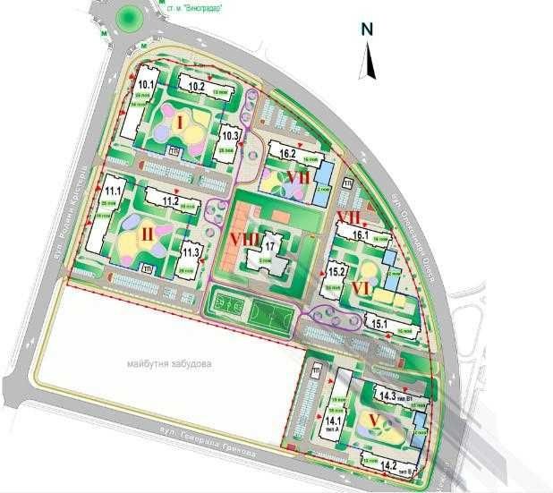 13 будинків різної поверховості (13–25 поверхів)