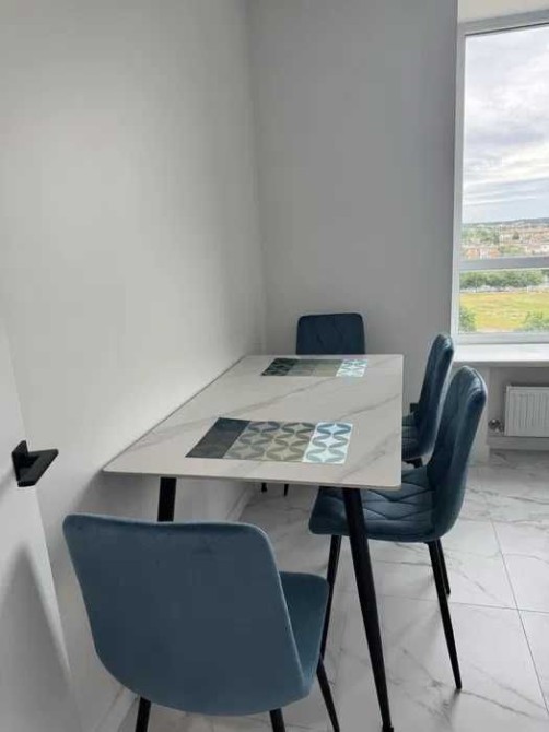 Простір доповнює обідній стіл з керамічною стільницею та зручні мʼякі стільці.