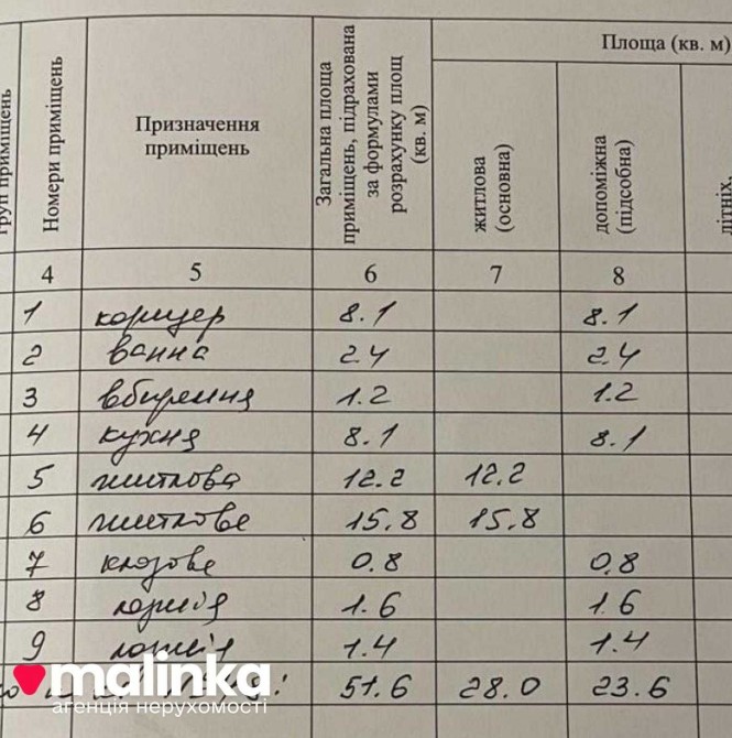 Загальна площа — 51.6 м², житлова — 28 м², кухня — 8.1 м².