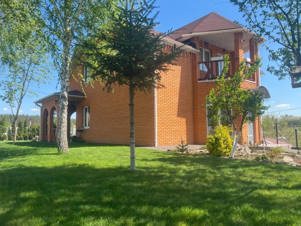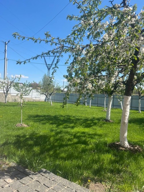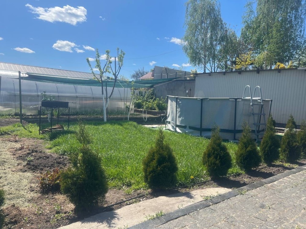 Будинок та ділянка потопають у зелені фруктових дерев, берез, туй, розаріїв, зелених насаджень та квітів, що створюють прекрасну атмосферу спокою та відпочинку.