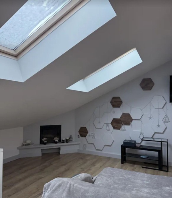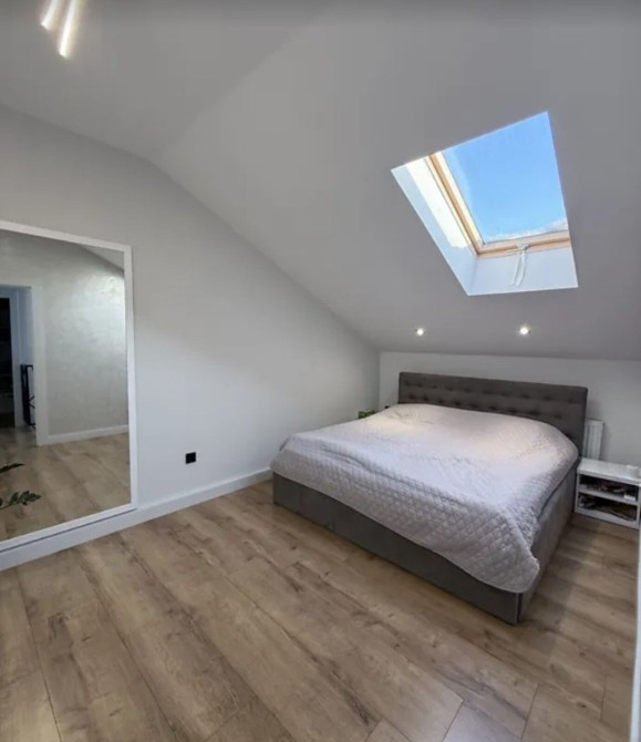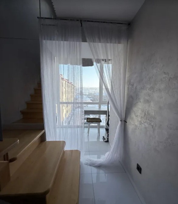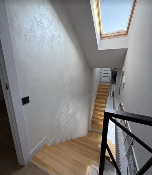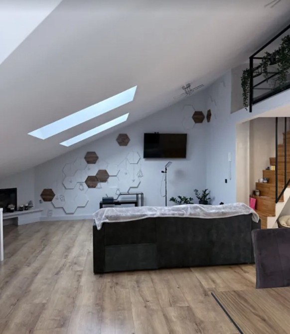 Квартира загальною площею 105 кв. м, дворівнева, верхній рівень мансардний.