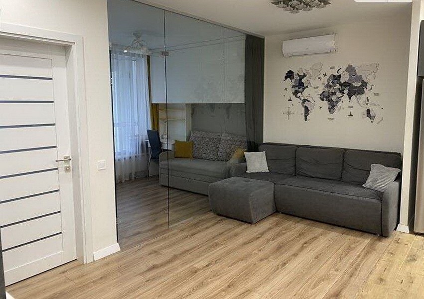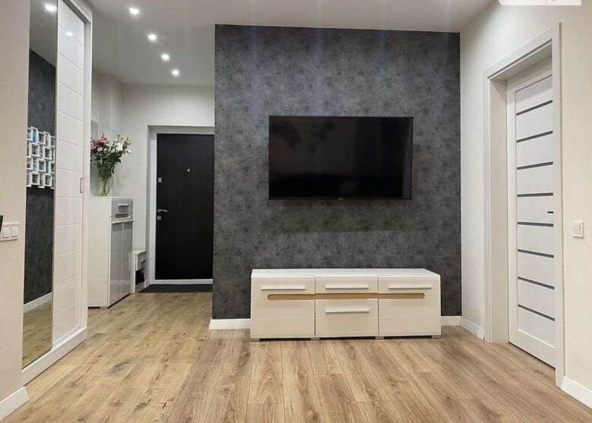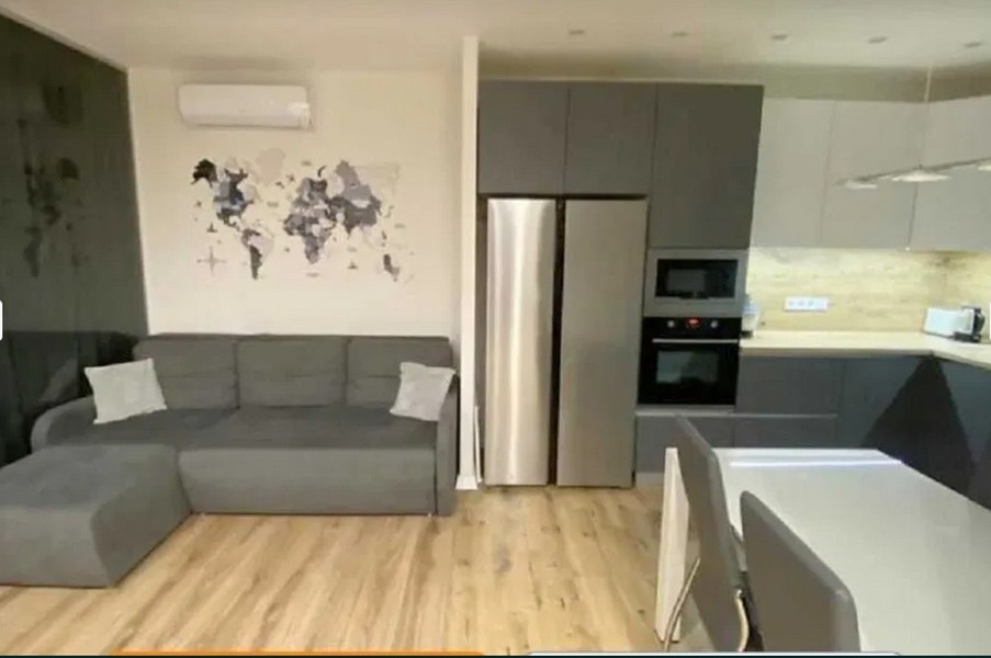 ---Кухня-вітальня 26 м²: є вся техніка, фільтр для води, холодильник side-by-side з великою морозильною камерою, розкладний стіл. Є підсвітка робочої поверхні та встановлено багато розеток для кухонної техніки. У вітальні телевізор 55", розкладний диван з великою нішею для зберігання.