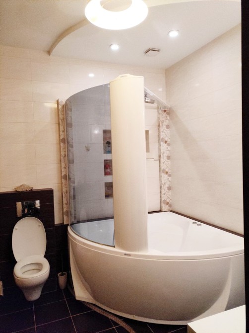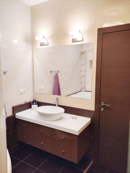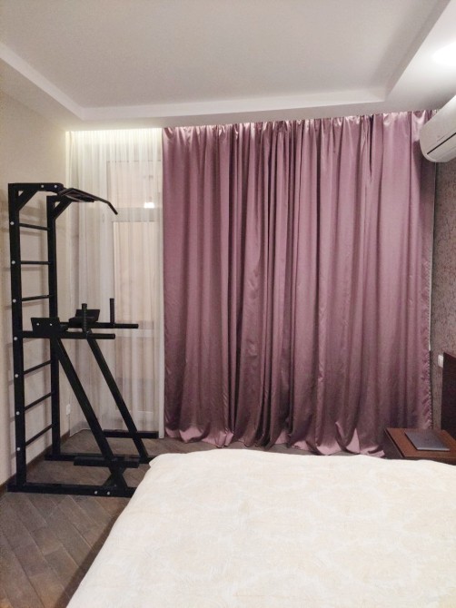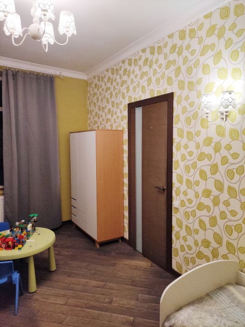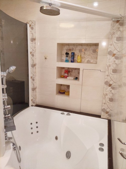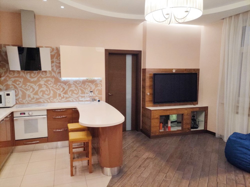 Загальна площа 84 м кв, функціональне планування: хол, кухня-вітальня, спальня, дитяча кімната, два санвузли (є гідромасажна ванна), простора лоджія. Світла і простора, висота стель 3 м.