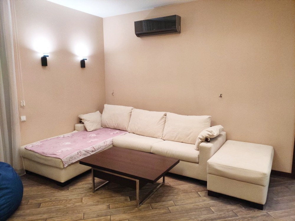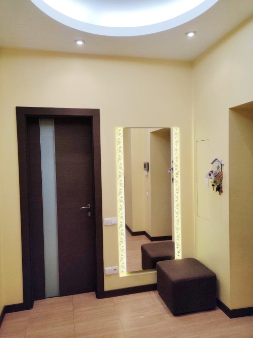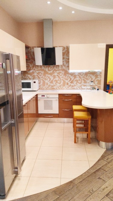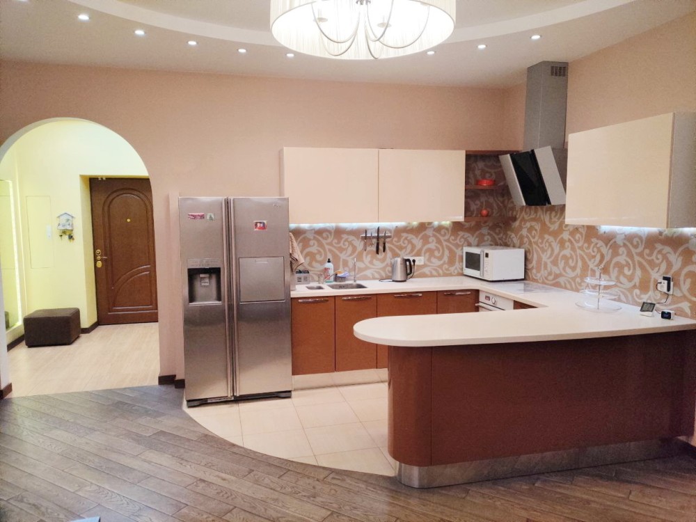 Ремонт в квартирі враховує потребу в комфорті для всієї родини: тепла підлога, кондиціонери, великий холодильник, вбудовані шафи, багато місць для зберігання.