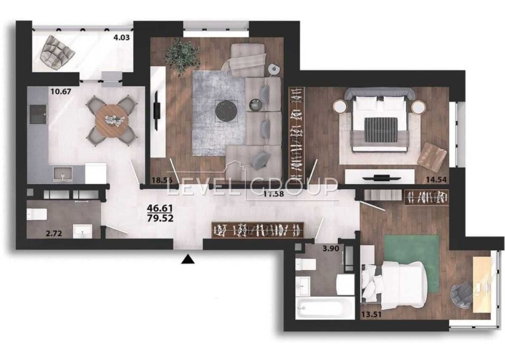 Площа: 79.6 м² (спальня, дитяча, вітальня, кухня-їдальня, гардеробна)