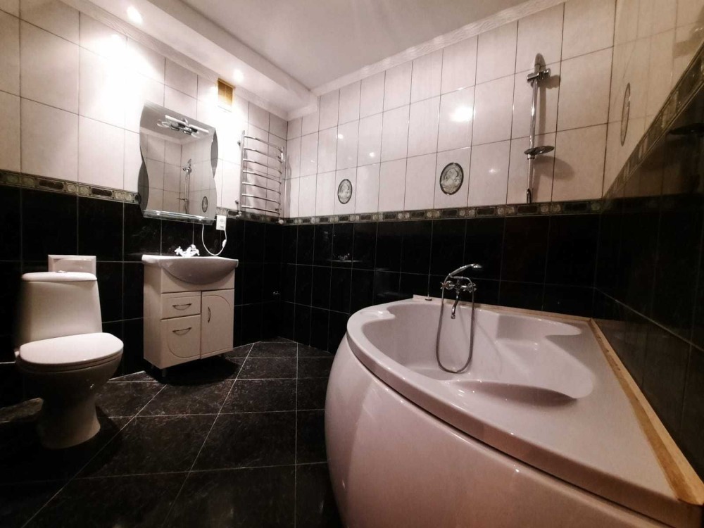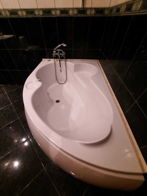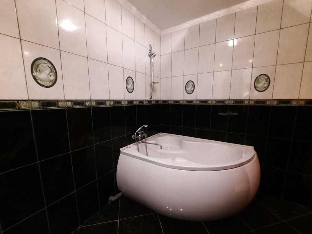 На підлозі постелено ламінат, на кухні та у ванній кімнаті керамічна плитка, ванна з сан-вузлом суміжні, велика (глибока) ванна.