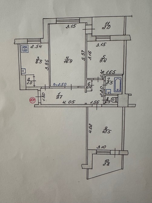 Квартира знаходиться на 8 поверсі 9-ти поверхового будинку. 66 - загальна / 38,3 - житлова / 8,5 - кухня; 16,9 + 12.5 +9,4 - три кімнати; 9,1- великий передпокій; 2,8 - засклена лоджія з виходом з кімнати (12,5); 2,0 балкон вихід із залу ; роздільний санвузол.