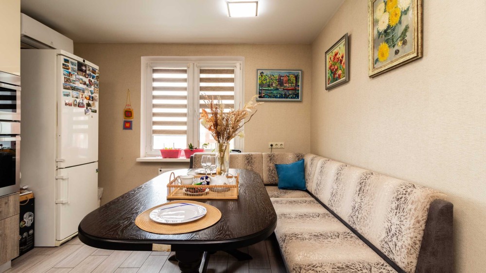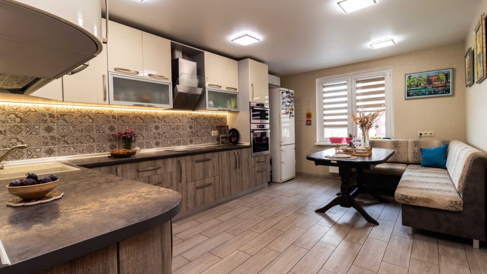 Простора кухня 18 м² із вбудованою технікою Bosch (духова шафа, варильна поверхня, посудомийна машина, мікрохвильова піч) та обідньою зоною — ідеальний варіант для сімейних вечорів та прийому гостей.