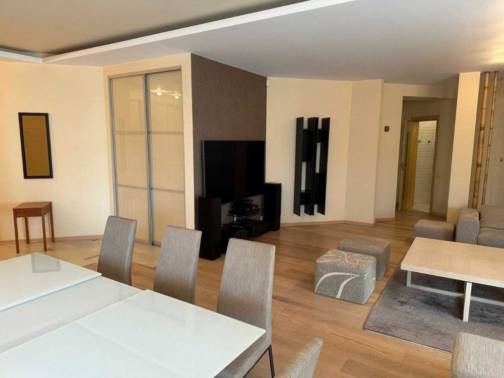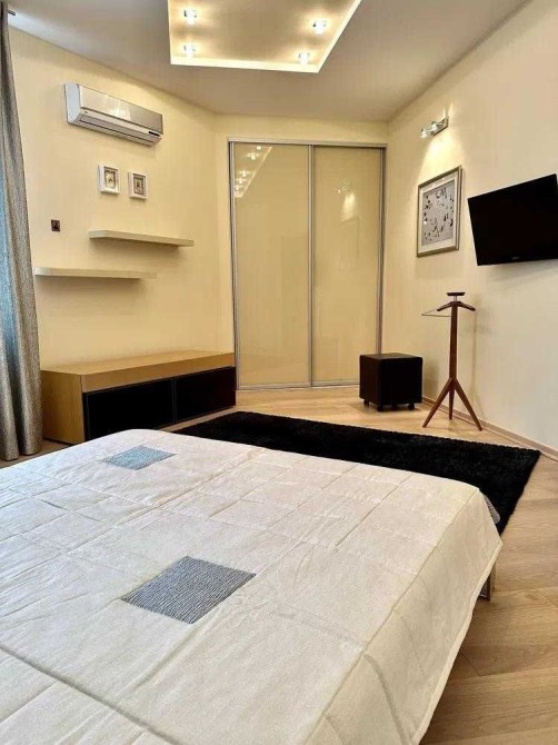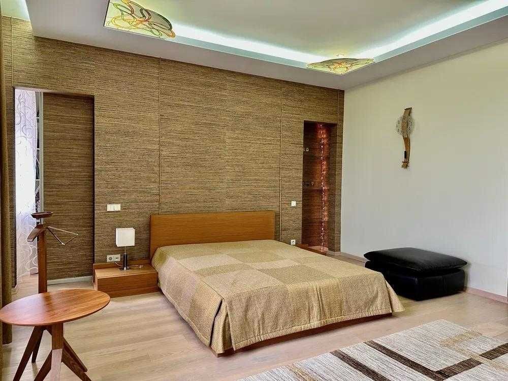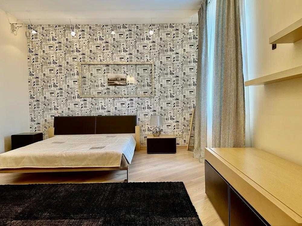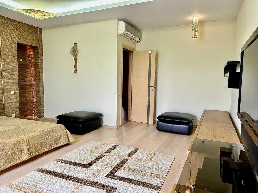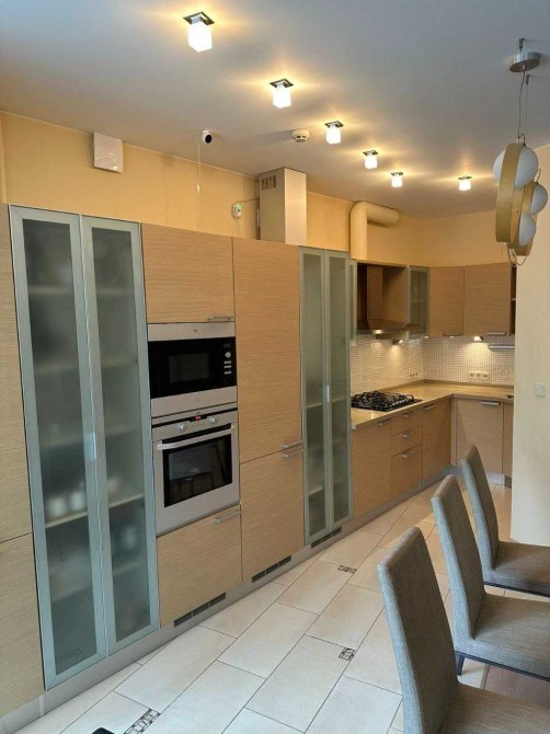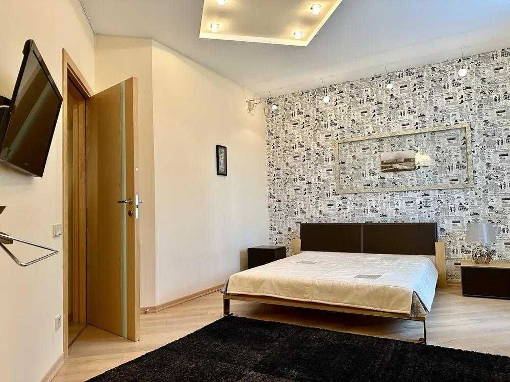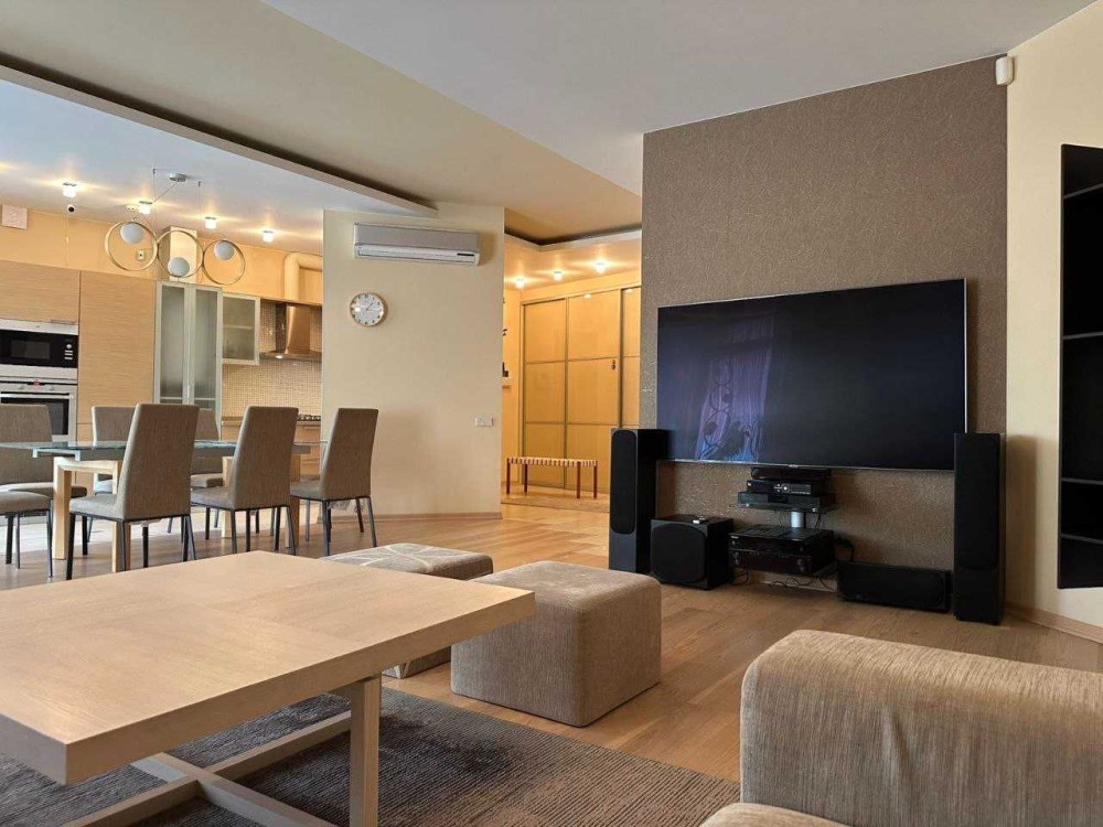 Квартира складається із: кухні-студії (~70 кв. м. ) та трьох кімнат (~22, 28 і 15 кв. м. ) Кожна кімната має свій гардероб, ванна кімната площею 21 кв. м. із сауною. Кухня має дві комори. Одну холодну для продуктів, друга для різних господарських речей. З кухні студії можна вийти на засклений балкон з виглядом у двір будинку. Дизайнерські батареї, підлога натуральна, дорога італійська сантехніка, плитка, італійські меблі. Вся вода, що подається в квартиру проходить через власну систему хім очистки.Квартира облаштована охоронною системою сигналізації. Все що є в квартирі залишається.