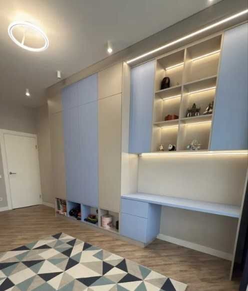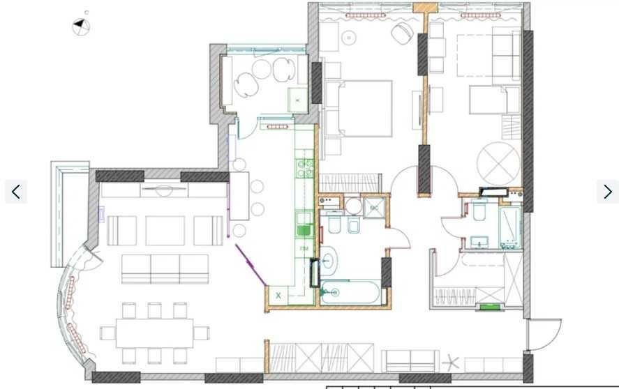 Великий зал суміжний з кухнею, два балкони, два сан.вузли, гардеробна кімната, спальня та дитяча кімната.