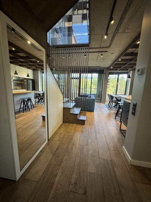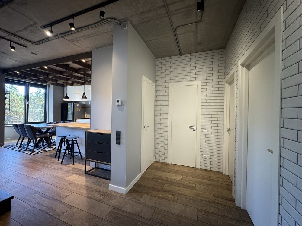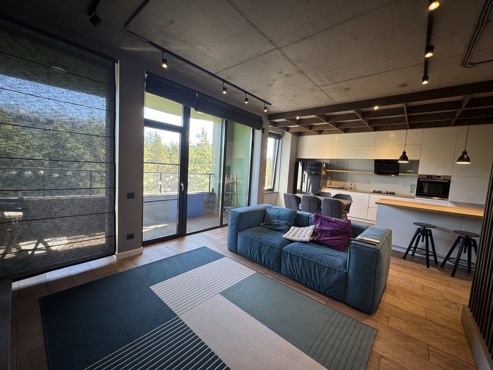 Сучасне планування, доповнене трьома балконами з панорамними вікнами розширює візуально простір і створює ефект «приватного будинку» завдяки виду на сосни і гармонічному розташуванні на території, яке створює відчуття приватності.