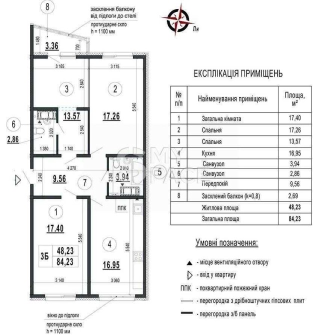 планування: 3 окремих кімнати, кухня-вітальня, 2 великих санвузли, окрема гардеробна кімната/комірчина та балкон