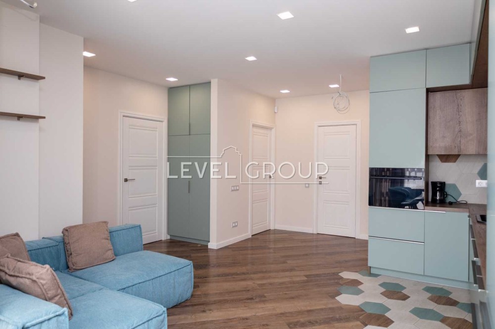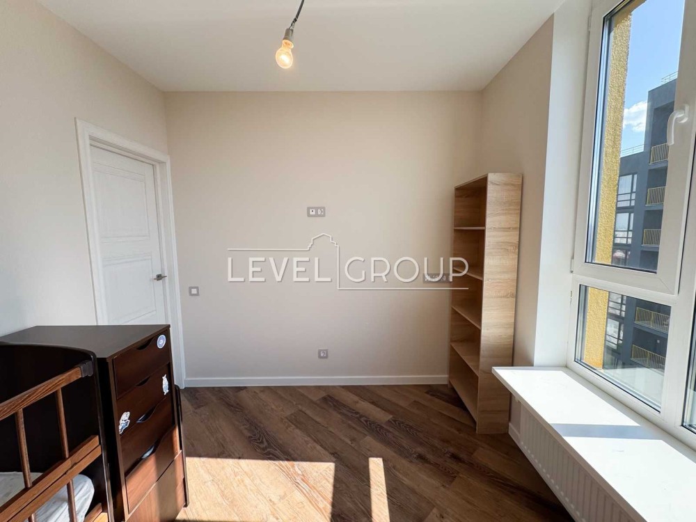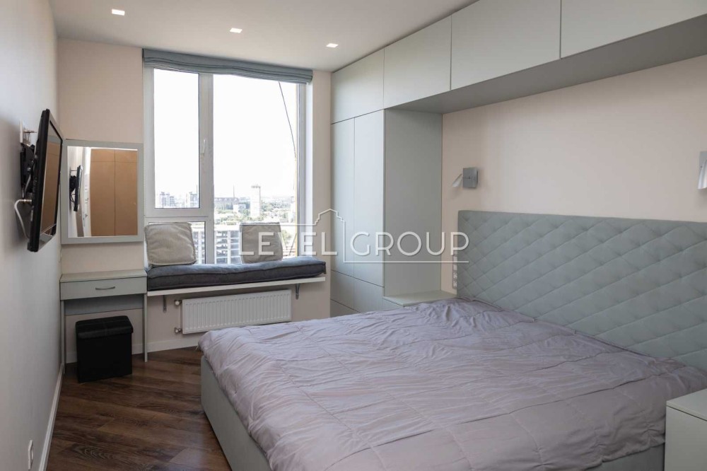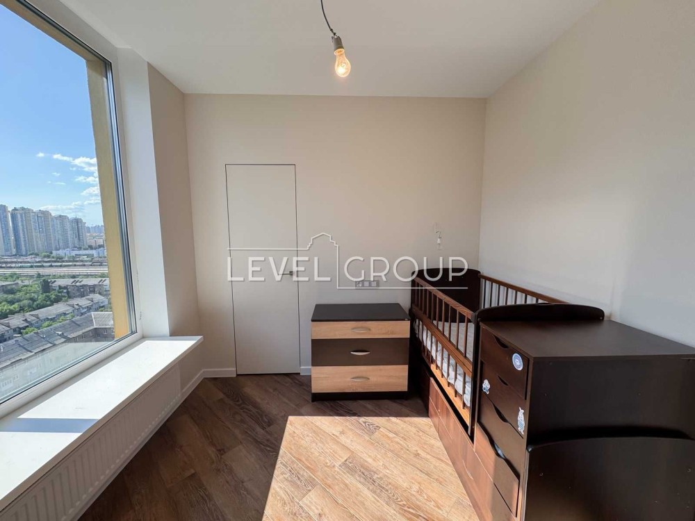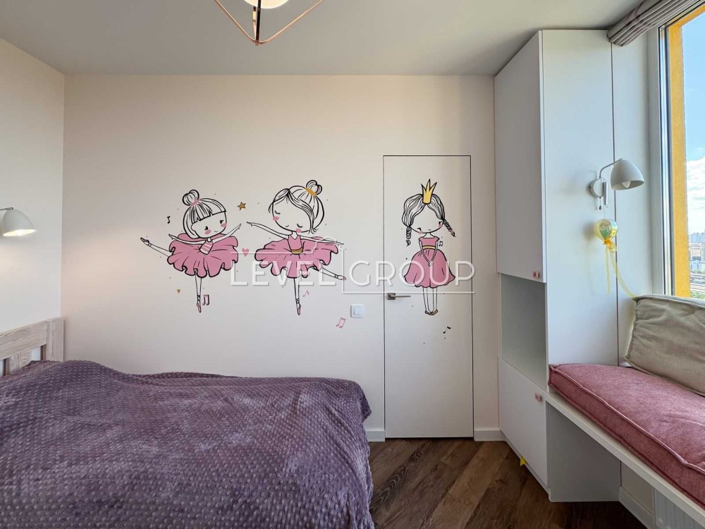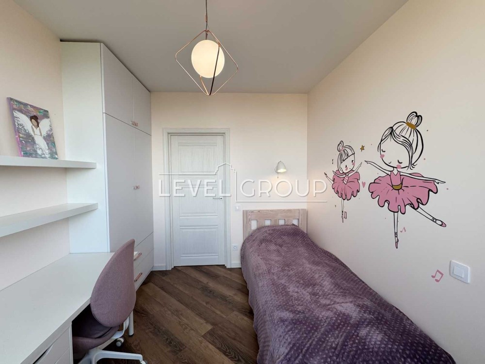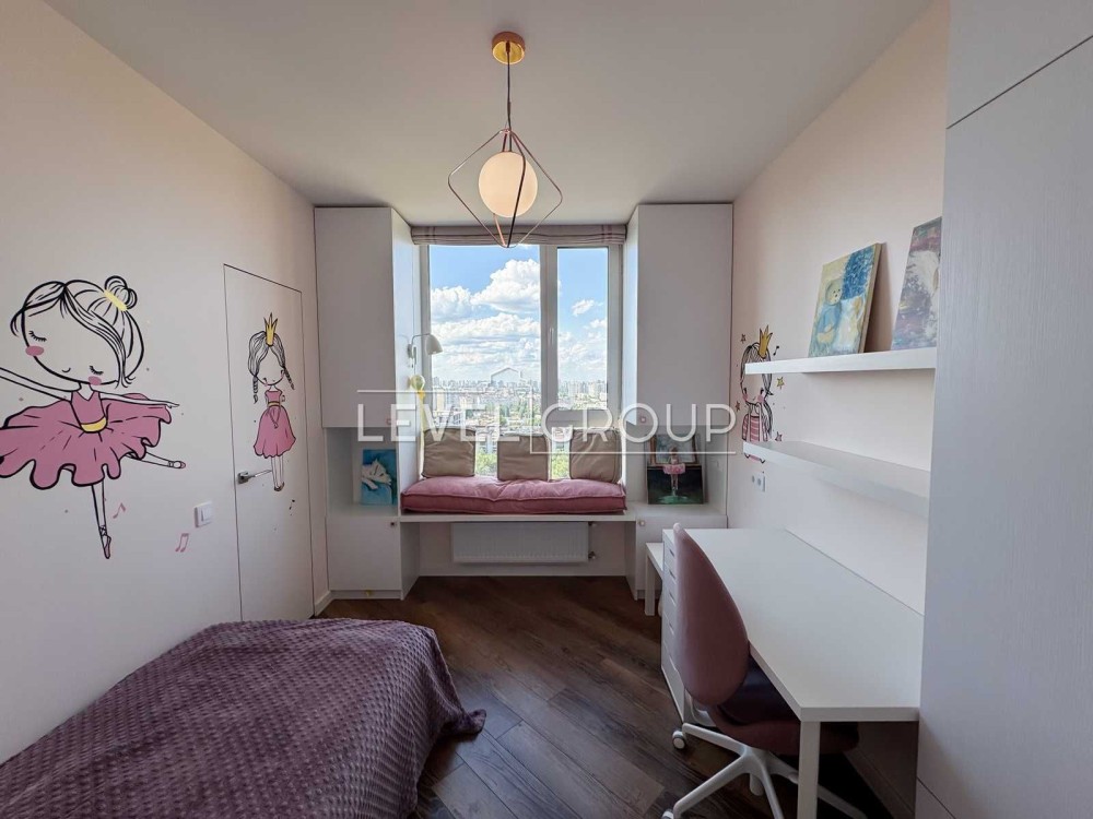 Квартира на 20 поверсі, має три окремі кімнати: спальню, дві дитячі з гардеробами, простору кухню-вітальню, гостьовий санвузол, ванну кімнату та балкон.